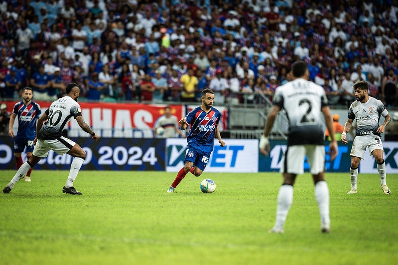 Por outro lado, o Corinthians armou-se com três zagueiros e dois alas, na tentativa de bloquear o espaço central do campo e neutralizar a amplitude do Bahia. Apesar da estratégia, o time paulista foi pressionado desde o início, com o Bahia dominando a posse de bola e criando chances perigosas no gol defendido por Hugo Souza nos 15 minutos iniciais. Contudo, a falta de eficiência nas finalizações permitiu que o Corinthians equilibrasse o jogo.