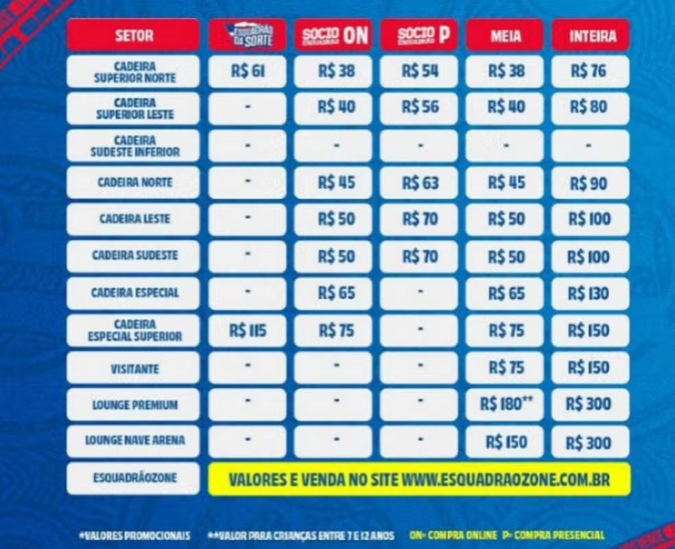 Os ingressos podem ser comprados nas bilheterias da Arena Fonte Nova, no site da Arena ou em um dos três pontos de venda do clube, que aceitam pagamento via Pix. Com exceção da bilheteria da Fonte Nova, os demais locais não aceitarão pagamento em dinheiro. Confira a programação completa com todos os dias e horários de venda: