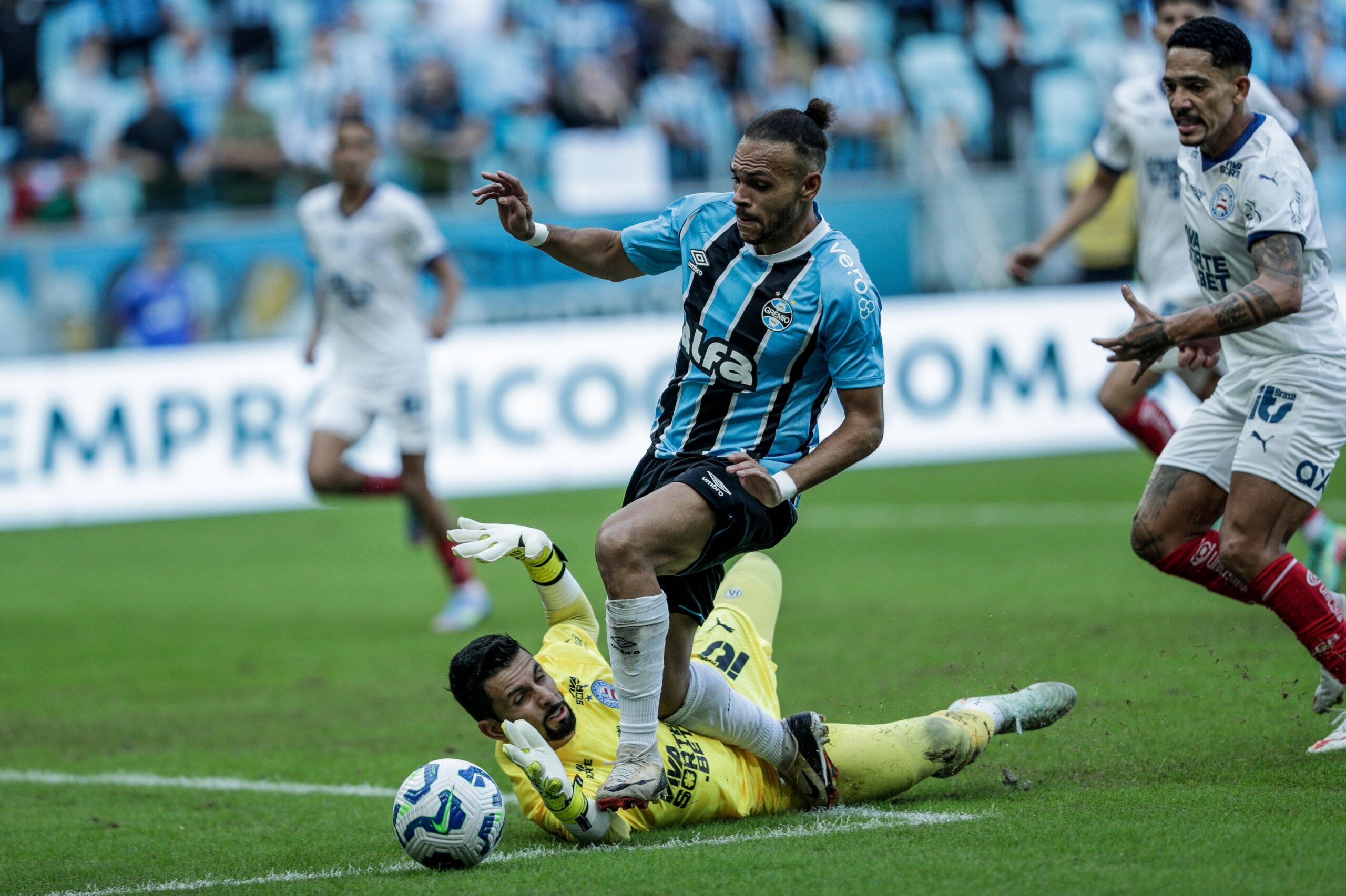O lance ocorreu aos 8 minutos da segunda etapa, após um choque dentro da área entre o goleiro Marcos Felipe, do Bahia, e o atacante Braithwaite, do Grêmio. A jogada causou uma interrupção de aproximadamente sete minutos até a confirmação da penalidade.