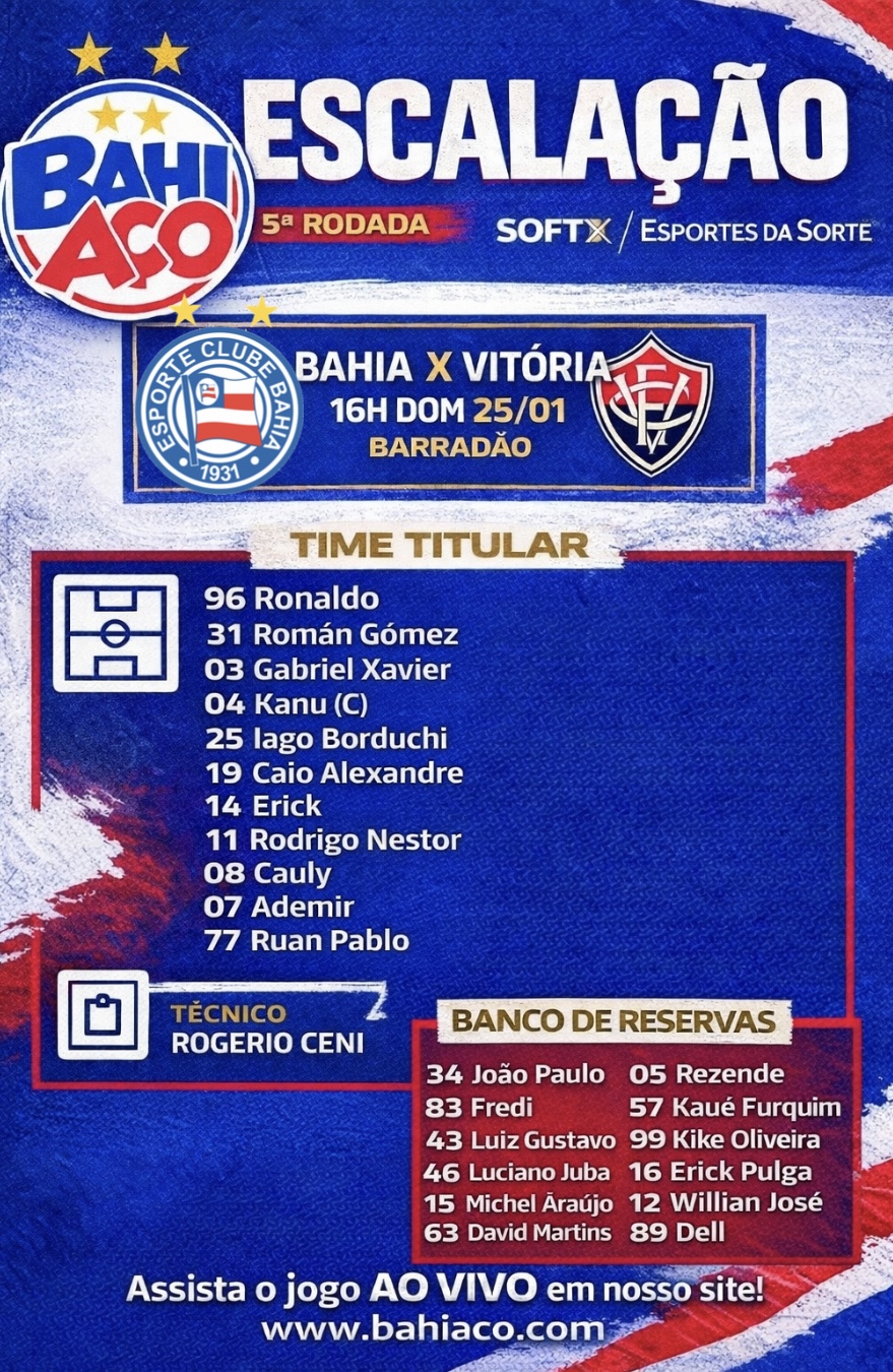 O Esporte Clube Bahia está definido para o clássico Ba-Vi deste domingo (25), às 16h, no Barradão, válido pela 5ª rodada do Campeonato Baiano. O técnico Rogério Ceni confirmou a escalação tricolor para o confronto diante do Vitória, apostando em um time equilibrado, com força no meio-campo e velocidade no ataque.